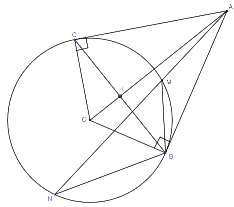 từ điểm A bên ngoài đường tròn (O) vẽ 2 tiếp quyến AB , AC với đường tròn , H là giao điểm của OA và BC