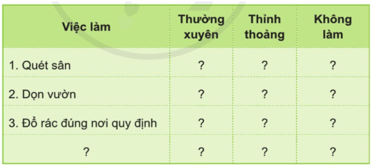 Giải Tự nhiên xã hội lớp 3 trang 21 câu 2: Hãy tự đánh giá việc giữ vệ sinh xung quanh nhà ở của em theo gợi ý dưới đây và chia sẻ với các bạn.