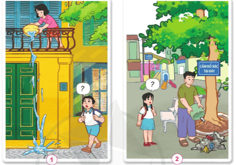 - Tình huống 1: Em sẽ nhắc nhở bạn không được xả nước bẩn từ trên xuống lòng đường. Vì như thế sẽ gây mất mĩ quan, có thể đổ nước trúng người qua đường và không đảm bảo vệ sinh môi trường.