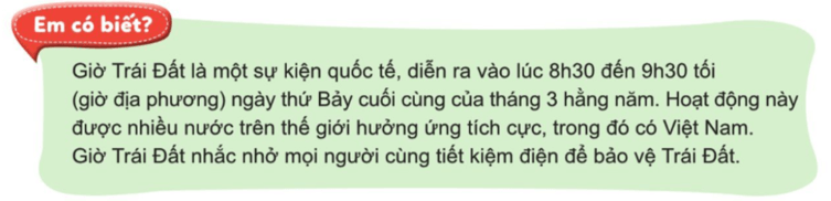 Giải Tự nhiên xã hội lớp 3 trang 26 câu 2: Nói về một số việc làm của em để hưởng ứng Giờ Trái Đất.