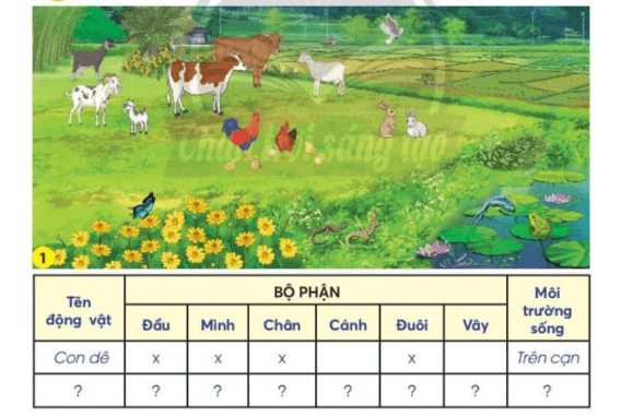 Giải Tự nhiên xã hội lớp 3 trang 72 câu hỏi: Quan sát các động vật trong hình dưới đây và hoàn thành bảng theo gợi ý.