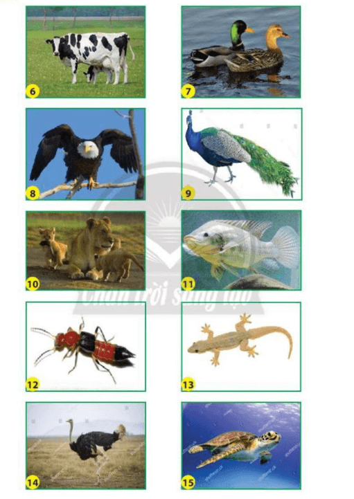 - Chân: 6. Bò sữa, 7. Vịt, 10. Báo, 12. Kiến, 13. Thằn lằn, 14. Đà điểu, 15. Rùa, 9. Công, 8. Đại bàng