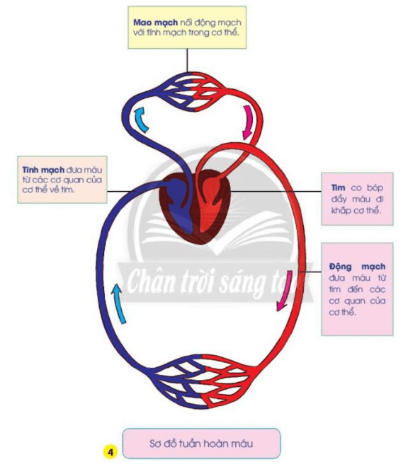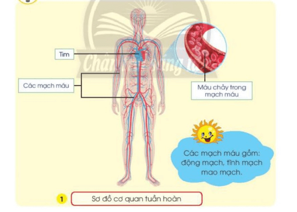Học sinh chỉ và nói tên các bộ phận của cơ quan tuần hoàn trong sơ đồ trên: tim, các mạch máu.