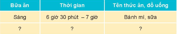 Giải Tự nhiên xã hội lớp 3 trang 80 câu 1: Chia sẻ với bạn về các bữa ăn hằng ngày của em theo gợi ý sau: