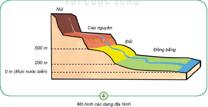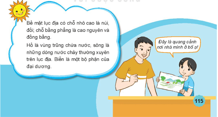 Học sinh chỉ núi, đồi, cao nguyên, đồng bằng, sông, hồ, biển ghi trong hình.