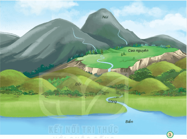 Giải Tự nhiên xã hội lớp 3 trang 112, 113 câu 1: Quan sát hình 3 và chỉ núi, đồi, cao nguyên, đồng bằng, sông, hồ, biển.