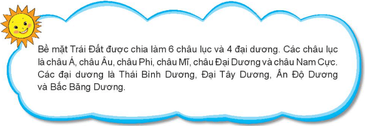 - Các châu lục: Châu Mĩ, châu Âu, châu Phi, châu Á, châu Đại Dương, châu Nam Cực.