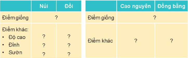Giải Tự nhiên xã hội lớp 3 trang 113 câu 2: Quan sát hình 3 và hình 4, em hãy mô tả núi, đồi, cao nguyên, đồng bằng dựa vào gợi ý: cao, dốc, tương đối tròn, thoải, thấp, thường nhọn, bằng phẳng.