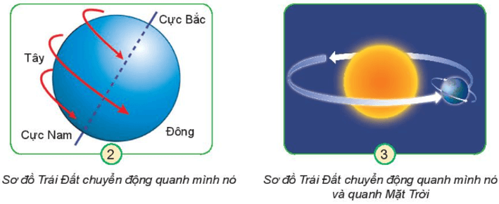 - Học sinh chỉ và nói chiều chuyển động của Trái Đất quanh mình nó và quanh Mặt Trời: Trái Đất tự quay quanh trục theo chiều từ Tây sang Đông và quay quanh Mặt Trời theo chiều từ Tây sang Đông.