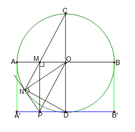 2. Vì K là trung điểm NP nên OK ⊥ NP (quan hệ đường kính và dây cung) => ÐOKM = 900. Theo tính chất tiếp tuyến ta có ÐOAM = 900; ÐOBM = 900. như vậy K, A, B cùng nhìn OM dưới một góc 900 nên cùng nằm trên đường tròn đường kính OM.