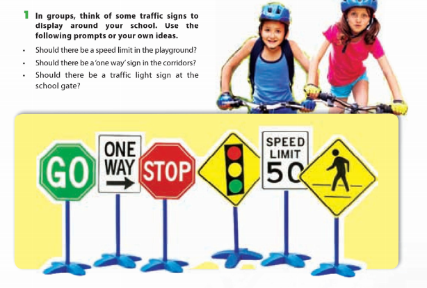 1. In groups, think of some traffic signs to display around your school. Use the following prompts or your own ideas.
