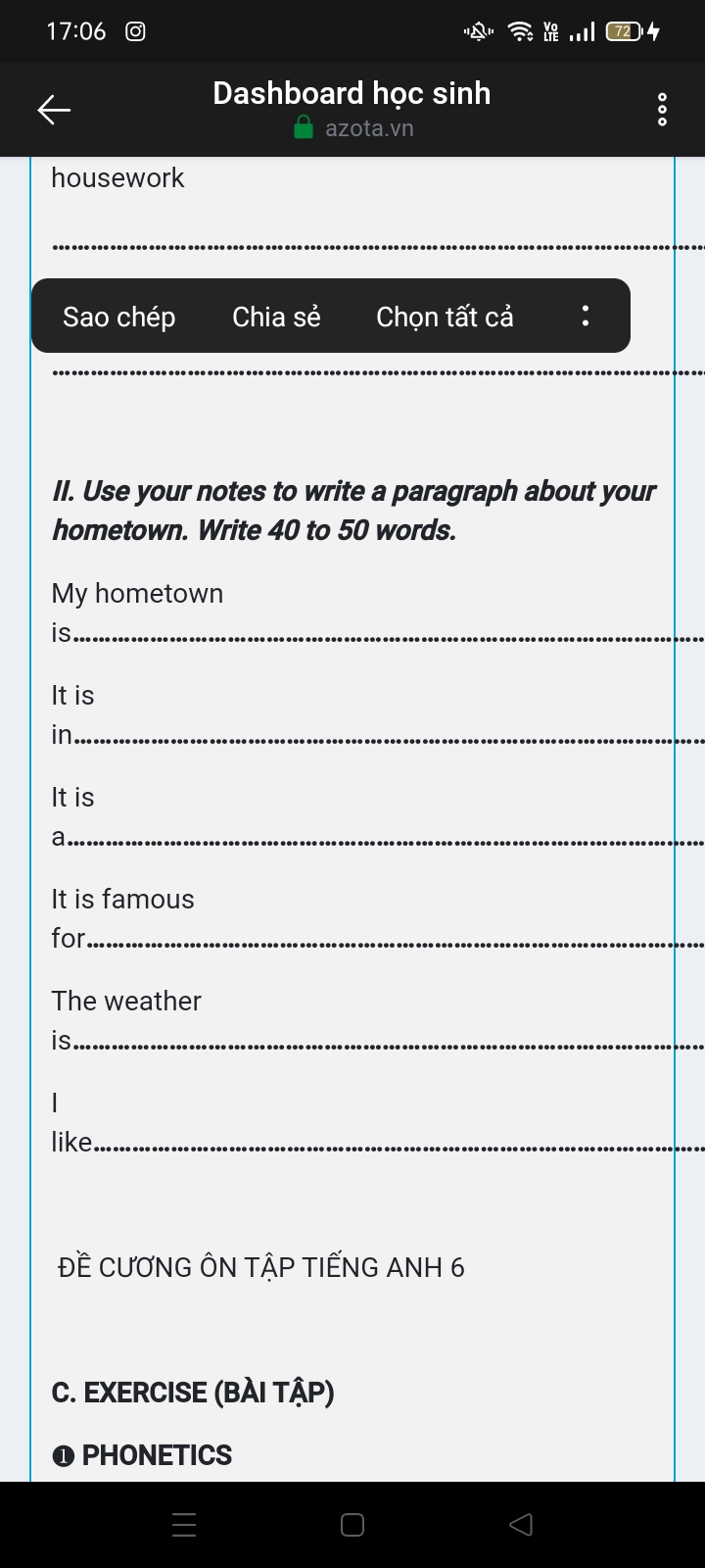 . Use the reading to help you. Write 40 - 50 word. Sử dụng ghi chú trên để viết một đoạn văn về quê hương của em. Sử dụng bài đọc để hỗ trợ viết. Viết 40-50 từ.