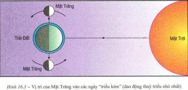 Dựa vào hình 16.3 (SGK trang 60), cho biết vào các ngày có dao động thuỷ triều nhỏ nhất, ở Trái Đất sẽ thấy Mặt Trăng như thế nào?