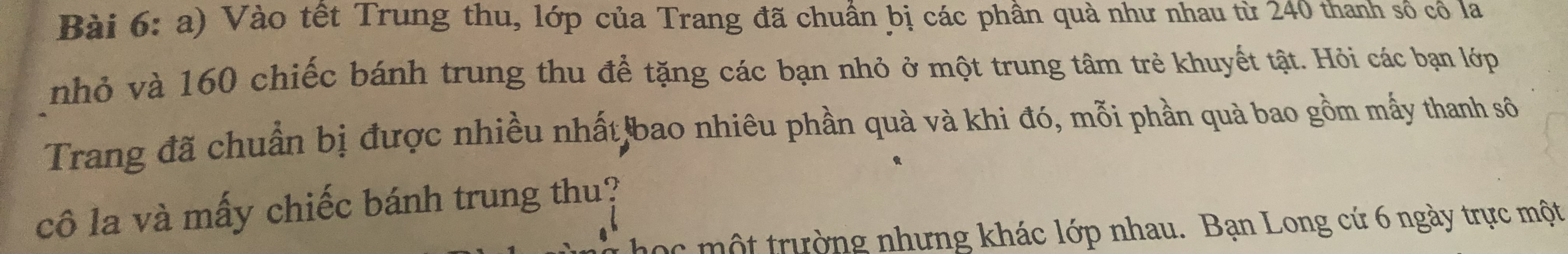và 160 chiếc bánh trung thu để tặng các bạn nhỏ ở một trung tâm trẻ khuyết tật. Hỏi các bạn lớp Trang đã chuẩn bị được nhiều nhất bao nhiêu phần quà và khi đó, mỗi phần quà bao gồm mấy thanh so-co-la và mấy chiếc bánh trung thu?