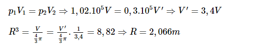 Người ta muốn chế tạo một bóng thám không có thể tăng bán kính lên tới 10 m khi bay ở tầng khí quyển có áp suất 0,3.105 Pa và nhiệt độ 200 K. Hỏi bán kính của bóng khi vừa bơm xong phải bằng bao nhiêu? Biết bóng được bơm ở áp suất 1,02.105 Pa và nhiệt độ 300 K.