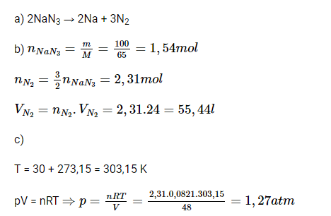c) Biết thể tích túi khí khi phồng lên có độ lớn tới 48 lít. Bỏ qua thể tích khí có trong túi trước khi phồng lên và thể tích của Na được tạo thành trong túi do phản ứng phân huỷ. Tính áp suất của khí N2 trong túi khí khi đã phồng lên, biết nhiệt độ là 30 °C.