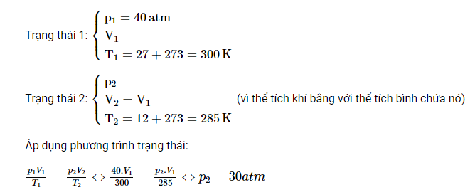 Bài tập 4 trang 54 Vật Lí 12: Một bình chứa một chất khí được nén ở nhiệt độ 27°C và áp suất 40 atm. Nếu nhiệt độ của khí giảm xuống còn 12°C và một nửa lượng khí thoát ra khỏi bình thì áp suất khí sẽ bằng bao nhiêu?
