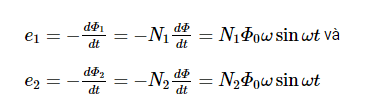 Theo định luật Faraday, ta có suất điện động cảm ứng sinh ra do sự biến thiên của từ thông qua cuộn sơ cấp và thứ cấp lần lượt là: