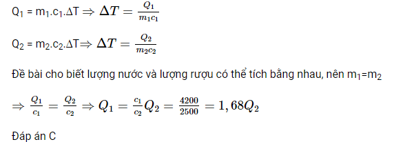 Đặt Q1 là nhiệt lượng cung cấp cho nước và Q2 là nhiệt lượng cung cấp cho rượu. Ta có: