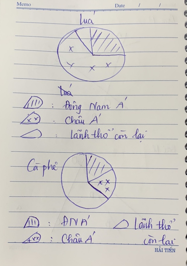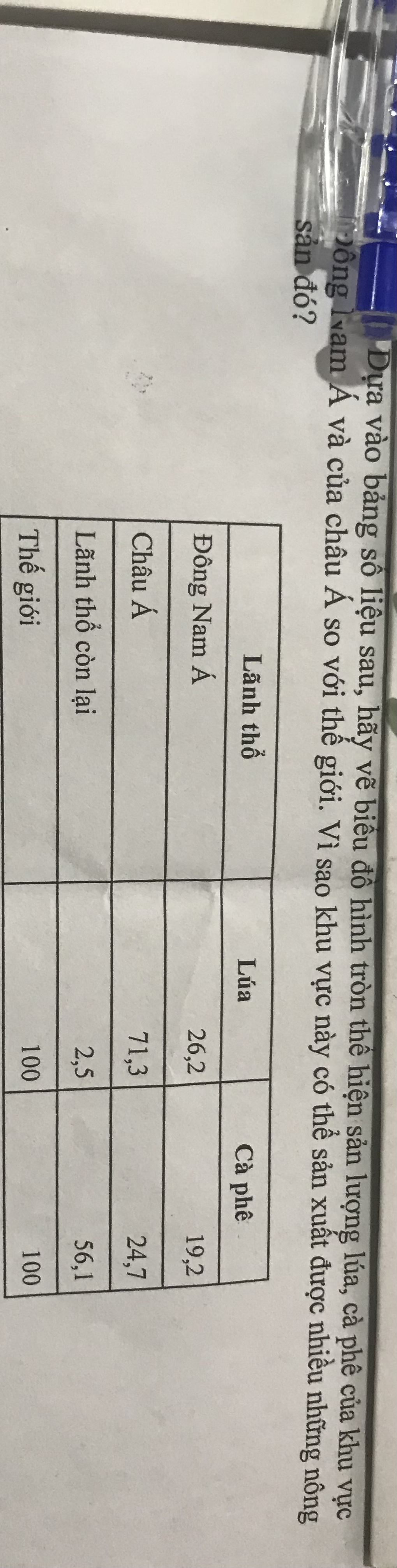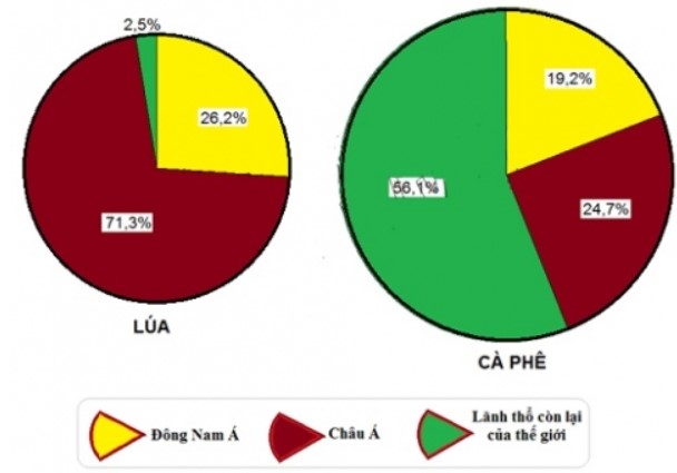 Vẽ biểu đồ hình tròn thể hiện sản lượng lúa, cà phê của khu vực Đông Nam Á