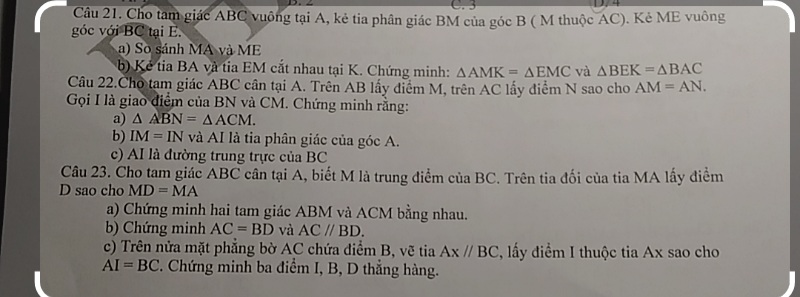 Cho tam giác ABC vuông tại A, tia phân giác BM