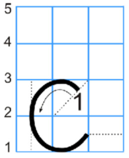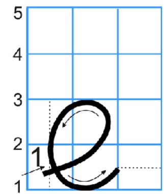Nét 1: Cong kín Đặt bút dưới đường kẻ 3 một chút, viết nét cong kín (từ phải sang trái). Nét 2: Móc ngược phải Từ điểm dừng bút của nét 1, lia bút lên đường kẻ 5 viết nét móc ngược (phải) sát nét cong kín; đến đường kẻ 2 thì dừng lại. |