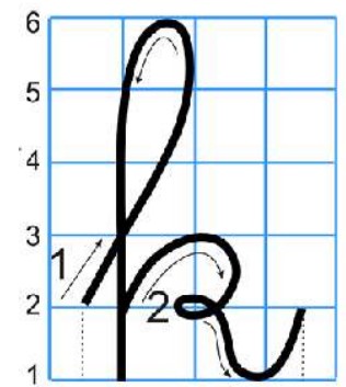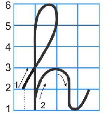 Đặt bút trên đường kẻ 2, viết nét khuyết xuôi (đầu nét khuyết chạm đường kẻ 6) nối liền với nét móc ngược (phải) chân nét móc chạm đường kẻ 1, kéo dài chân nét móc tới gần đường kẻ 3 thì lượn sang trái, tới đường kẻ 3 thì lượn bút trở lại sang phải, tạo vòng xoắn nhỏ ở cuối nét; dừng bút gần đường kẻ 3.
