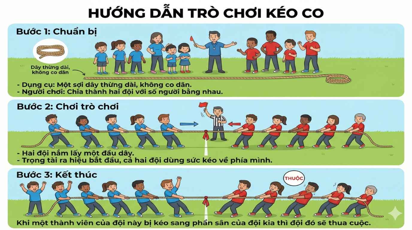 VIẾT HƯỚNG DẪN TRÒ CHƠI KÉO CO Kéo co là một trò chơi dân gian vừa đơn giản lại thú vị, giúp tăng tình đoàn kết trong một tập thể. Chính vì vậy, trường em thường xuyên tổ chức trò chơi này trong các sự kiện quan trọng. Cách chơi trò kéo co cũng vô cùng đơn giản và dễ thực hiện. Bước 1: Chuẩn bị