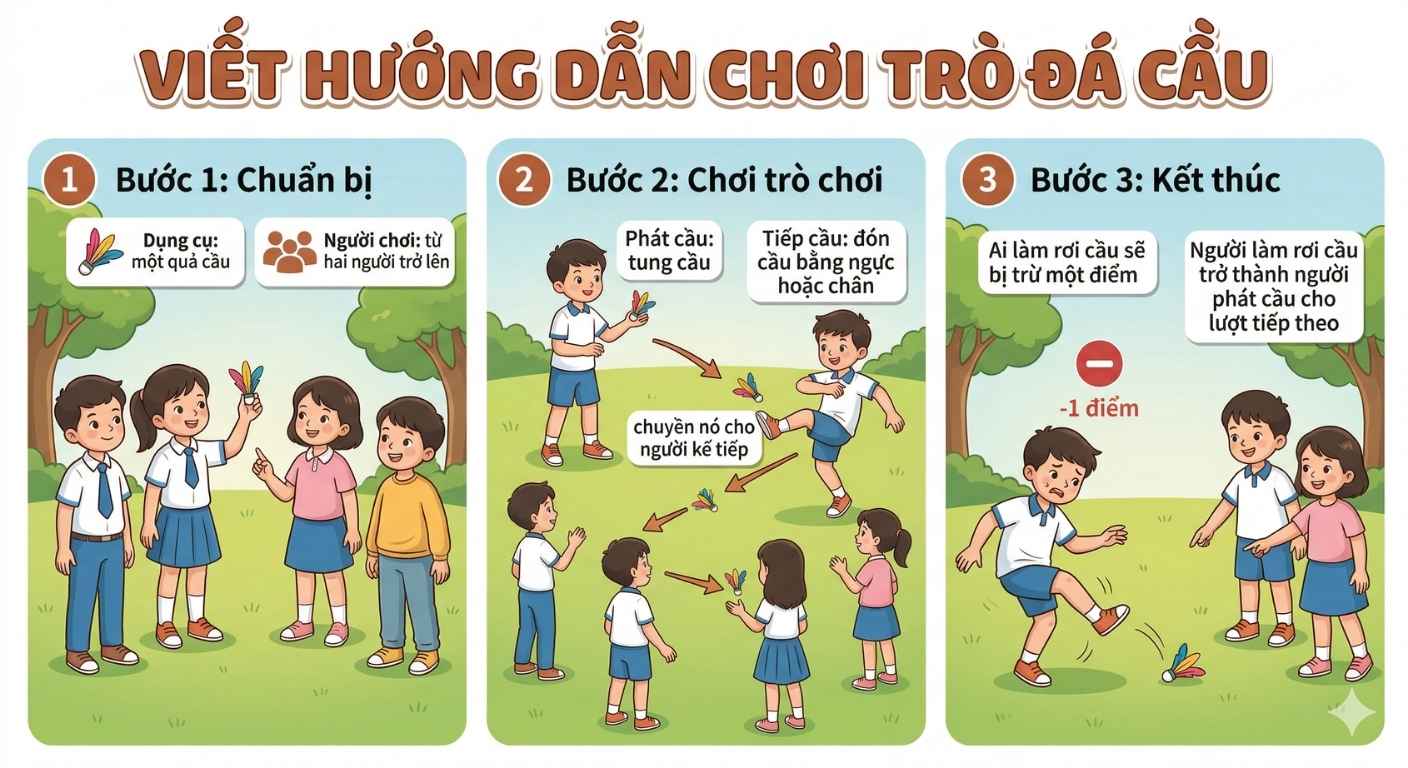 VIẾT HƯỚNG DẪN CHƠI TRÒ ĐÁ CẦU Đá cầu là một trò chơi quen thuộc với các bạn học sinh trong giờ giải lao hoặc lúc ở nhà. Bởi trò chơi này vừa đơn giản, có thể chơi ở bất kì đâu chỉ với một quả cầu - thứ mà gần như bạn nào cũng có vì là một dụng cụ học tập của môn Thể dục. Cách chơi thì rất đơn giản: Bước 1: Chuẩn bị: