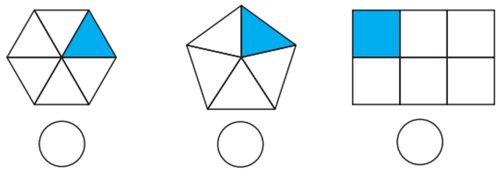 Viết dấu x vào ô trống dưới mỗi hình đã tô màu 1/6 hình đó