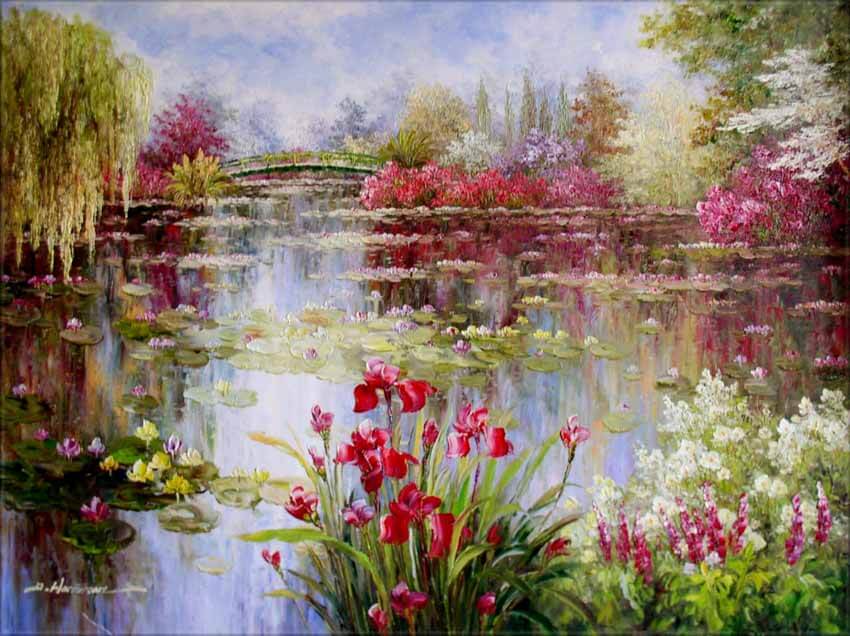 (1) Đây là bức tranh phong cảnh mùa xuân được treo ở phòng khách của gia đình em. (2) Bức tranh được vẽ bởi chất liệu sơn dầu, với những gam màu tươi sáng nhưng không quá chói, đem lại cảm giác dễ chịu cho người chiêm ngưỡng. (3) Trong bức tranh, bầu trời và cả mặt nước đều xanh biếc. (4) Cây cối xanh mướt, các loài hoa thì đua nhau khoe sắc sặc sỡ. (5) Tất cả cùng nhau tạo nên một khung cảnh tràn ngập sức sống. (6) Bên cạnh đó, người họa sĩ khéo léo sáng tạo các sự vật với đường nét không hề sắc sảo mà có chút nhòe, như thể một màn sương dày đặc trưng của mùa xuân lúc buổi sớm đang bao trùm lên cảnh vật. (7) Chi tiết đó khiến bức tranh như thực như mơ, dắt tâm hồn người ngắm đi vào một chiều không gian khác. (8) Điều đó làm cho bức tranh thêm bí ẩn và hấp dẫn đối với em hơn.