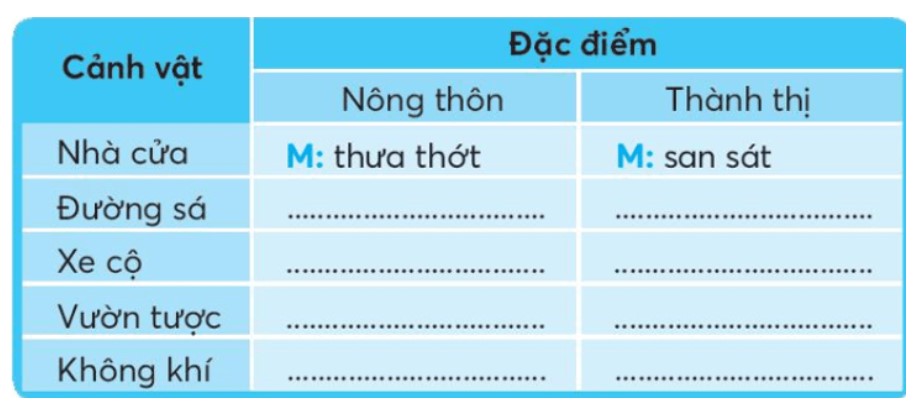 Viết từ ngữ chỉ đặc điểm của cảnh vật ở nông thôn và thành thị vào chỗ trống