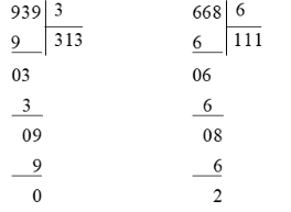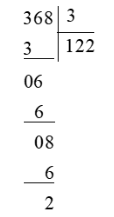 - 3 chia 3 bằng 1, viết 1 1 nhân 3 bằng 3, 3 trừ 3 bằng 0 - Hạ 6, 6 chia 3 bằng 2, viết 2 2 nhân 3 bằng 6, 6 trừ 6 bằng 0 + Hạ 8, 8 chia 3 bằng 2, viết 2 2 nhân 3 bằng 6, 8 trừ 6 bằng 2 Vậy 368 : 3 = 122 (dư 2) |