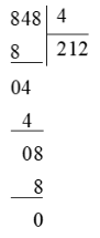 - 8 chia 4 bằng 2, viết 2 2 nhân 4 bằng 8, 8 trừ 8 bằng 0 - Hạ 4, 4 chia 4 bằng 1, viết 1 1 nhân 4 bằng 4, 4 trừ 4 bằng 0 + Hạ 8, 8 chia 4 bằng 2, viết 2 2 nhân 4 bằng 8, 8 trừ 8 bằng 0 Vậy 848 : 4 = 212 |