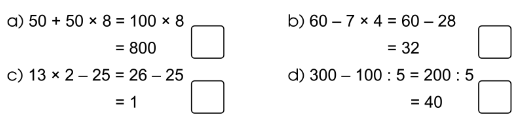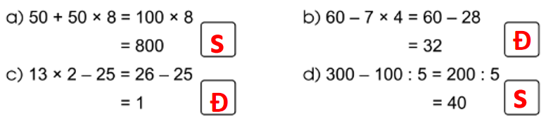 Kiểm tra cách tính giá trị của các biểu thức sau (đúng ghi Đ, sai ghi S vào ô trông), nếu sai hãy sửa lại cho đúng: