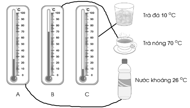 Học sinh quan sát nhiệt kế, xác định nhiệt độ đo được và nối với nhiệt độ đồ uống tương ứng.