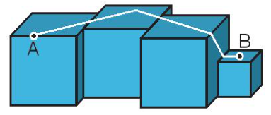 Trong hình là các khối gỗ dạng khối lập phương được đặt sát nhau. Một con kiến bò từ A đến B theo đường kẻ màu trắng (như hình vẽ).