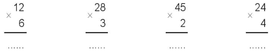 Phép tính 2: - 3 nhân 8 bằng 24, viết 4, nhớ 2 - 3 nhân 2 bằng 6, thêm 2 bằng 8, viết 8 28 x 3 = 84 |