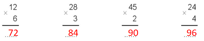 Phép tính 4: - 4 nhân 44 bằng 16, viết 6, nhớ 1 - 4 nhân 2 bằng 8, thêm 1 bằng 9, viết 9 24 x 4 = 96 |