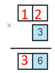 Phép tính 1: - 3 nhân 2 bằng 6, viết 6 - 3 nhân 1 bẳng 3, viết 3 12 x 3 = 36 |