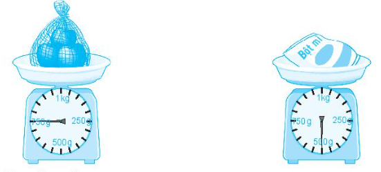 c) Gói bột mì nhẹ hơn túi táo là 250g (Vì 750 g - 500 g = 250 g)