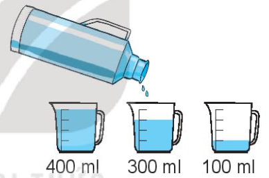 Trong phích có 1 l nước. Rót nước từ phích sang 3 ca (như hình vẽ).