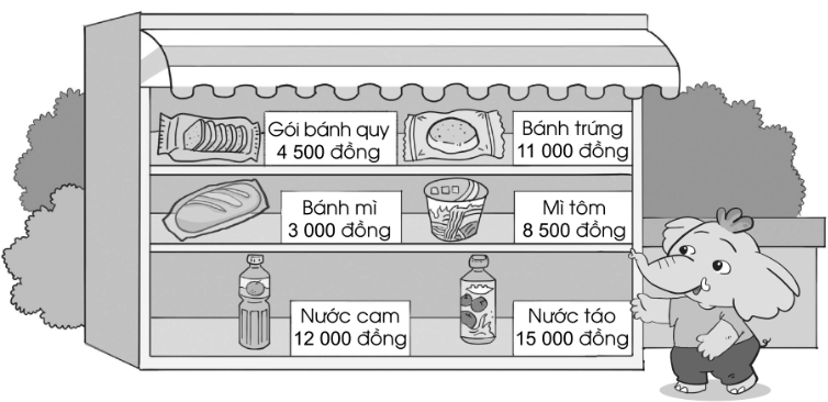 Chọn một mặt hàng em muốn mua ở bức tranh sau rồi tính xem nếu mua mặt hàng đó với số lượng là 5 thì cần trả bao nhiêu tiền.