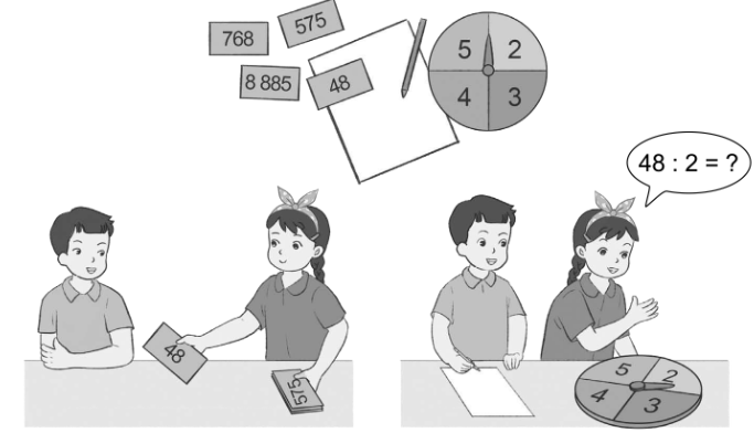 Lấy một thẻ số và chọn số ghi trên thẻ làm số bị chia, quay kim trên hình tròn để chọn số chia. Thực hiện phép chia rồi nêu kết quả:
