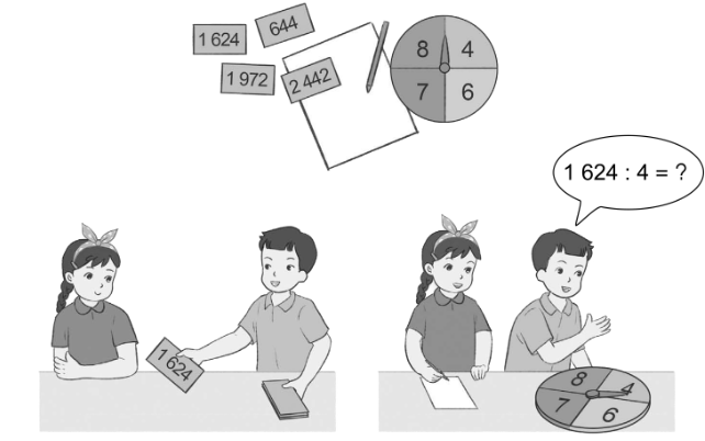 Lấy một thẻ số và chọn số ghi trên thẻ làm số bị chia, quay kim trên hình tròn để chọn số chia. Thực hiện phép chia rồi nêu kết quả.