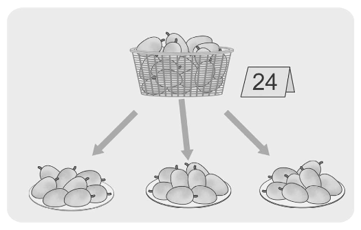 Trong rổ có 24 quả xoài, chia đều vào 3 đĩa.