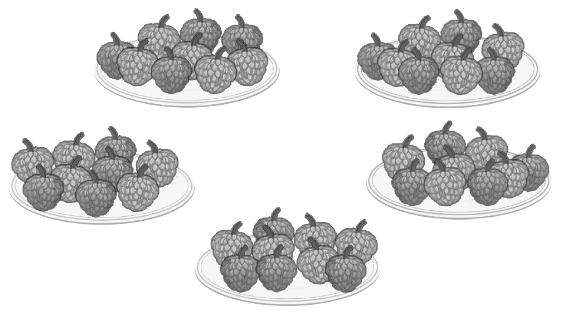 Có 5 đĩa na, mỗi dĩa có 9 quả na. Có tất cả 45 quả na.