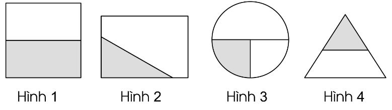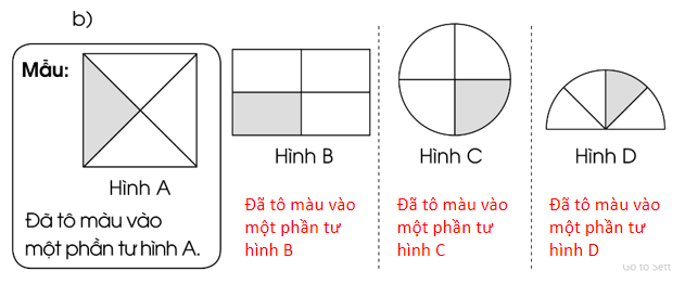 b) Hình 1 được chia thành 4 phần bằng nhau, tô 1 phần. Vậy đã tô màu