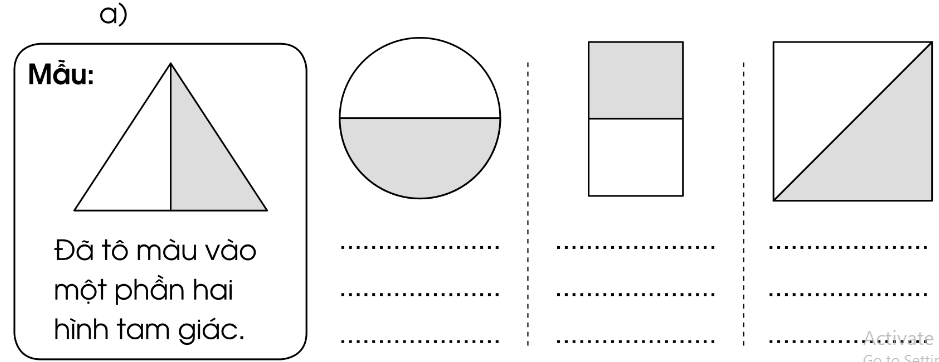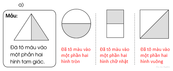 a) Hình 1 được chia thành 2 phần bằng nhau, tô 1 phần. Vậy đã tô màu