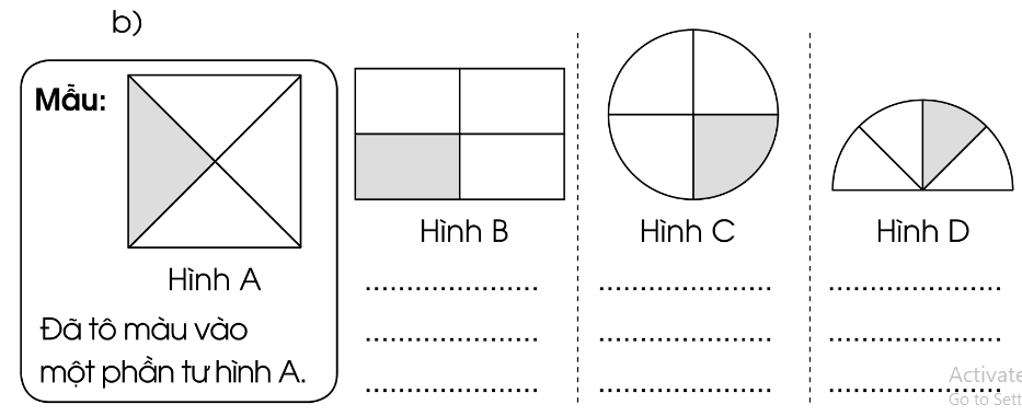 Đếm số phần bằng nhau ở mỗi hình và số phần được tô màu rồi thực hiện viết theo mẫu.